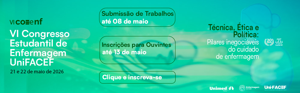 O VI Congresso Estudantil de Enfermagem é um evento acadêmico-científico promovido pelos estudantes e docentes do curso de Enfermagem do Uni-FACEF, com o objetivo de promover a integração, a troca de conhecimentos e a atualização científica voltada aos eixos fundamentais da prática profissional.